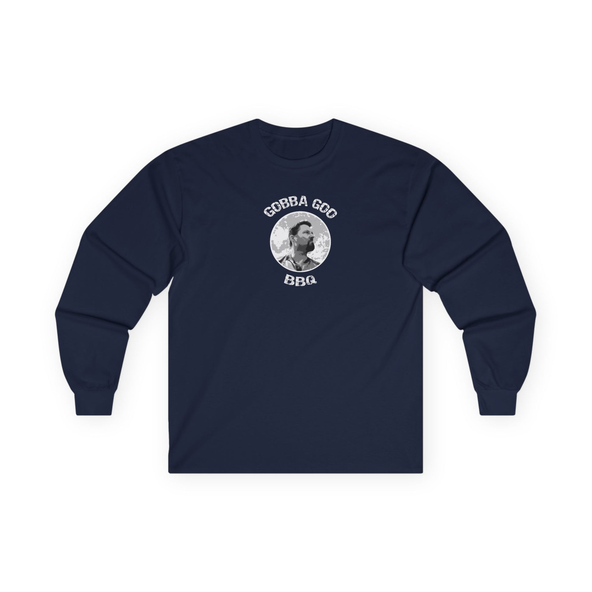 Navy Blue Gobba Goo BBQ Unisex Long Sleeve Tee with BBQ Theme, Funny Gift for BBQ Lovers, Casual Wear, Men’s and Women’s Tee, Outdoor Cooking Shirt